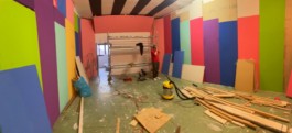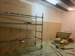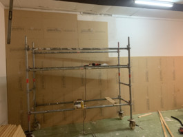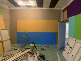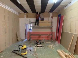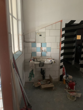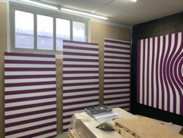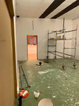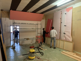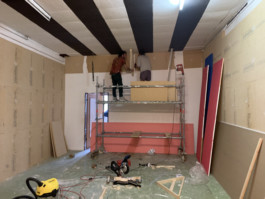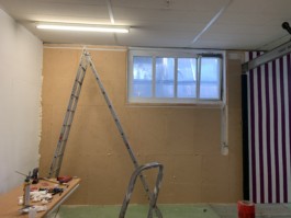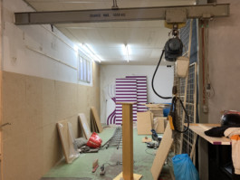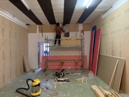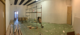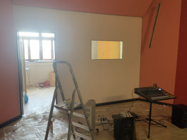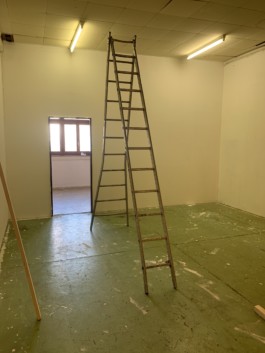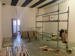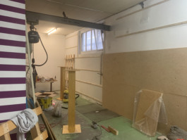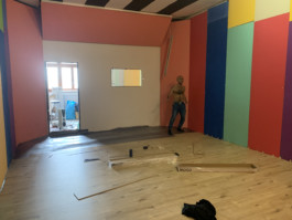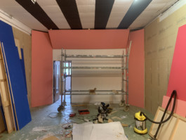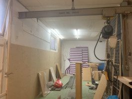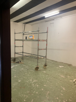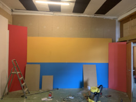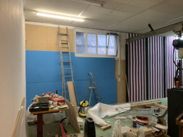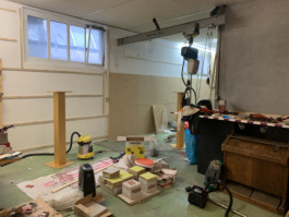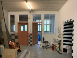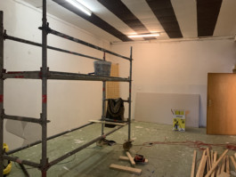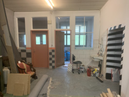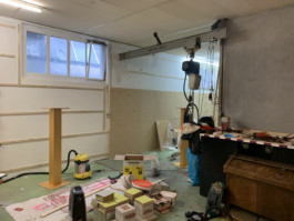 Cet espace est la partie commune que nous mettons à disposition pour les artistes. Il se compose d'une cuisine, une partie salon ainsi qu'un espace scénique, le tout fait environ 70 m 2. La scène est modulable et l'espace n'est donc pas uniquement fait pour accueillir des projets musicaux, toute discipline artistique est bienvenue.
